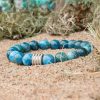 Se cree que llevar una pulsera de apatito azul tiene un efecto positivo en quien la lleva. Favorece la claridad de pensamiento, estimula las actividades intelectuales y mejora la capacidad de comunicación. Además, se dice que el apatita favorece el crecimiento personal, ayuda a perder peso y fomenta la confianza en uno mismo y la autoexpresión.