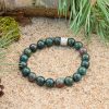 La pulsera de heliotropo está meticulosamente elaborada con cuentas de heliotropo pulidas y bruñidas, cuidadosamente ensartadas para crear una pieza de joyería impresionante. Los tonos verde oscuro de la piedra y el contraste de los puntos rojos crean un accesorio visualmente impactante y llamativo.