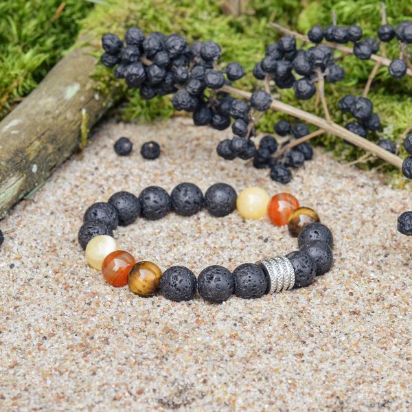 La piedra de lava, el ojo de tigre, la cornalina y la calcita forman parte de la pulsera Capricornio. Este conjunto de pulseras se ha elegido para resaltar y potenciar las personalidades y cualidades únicas de los Capricornio.